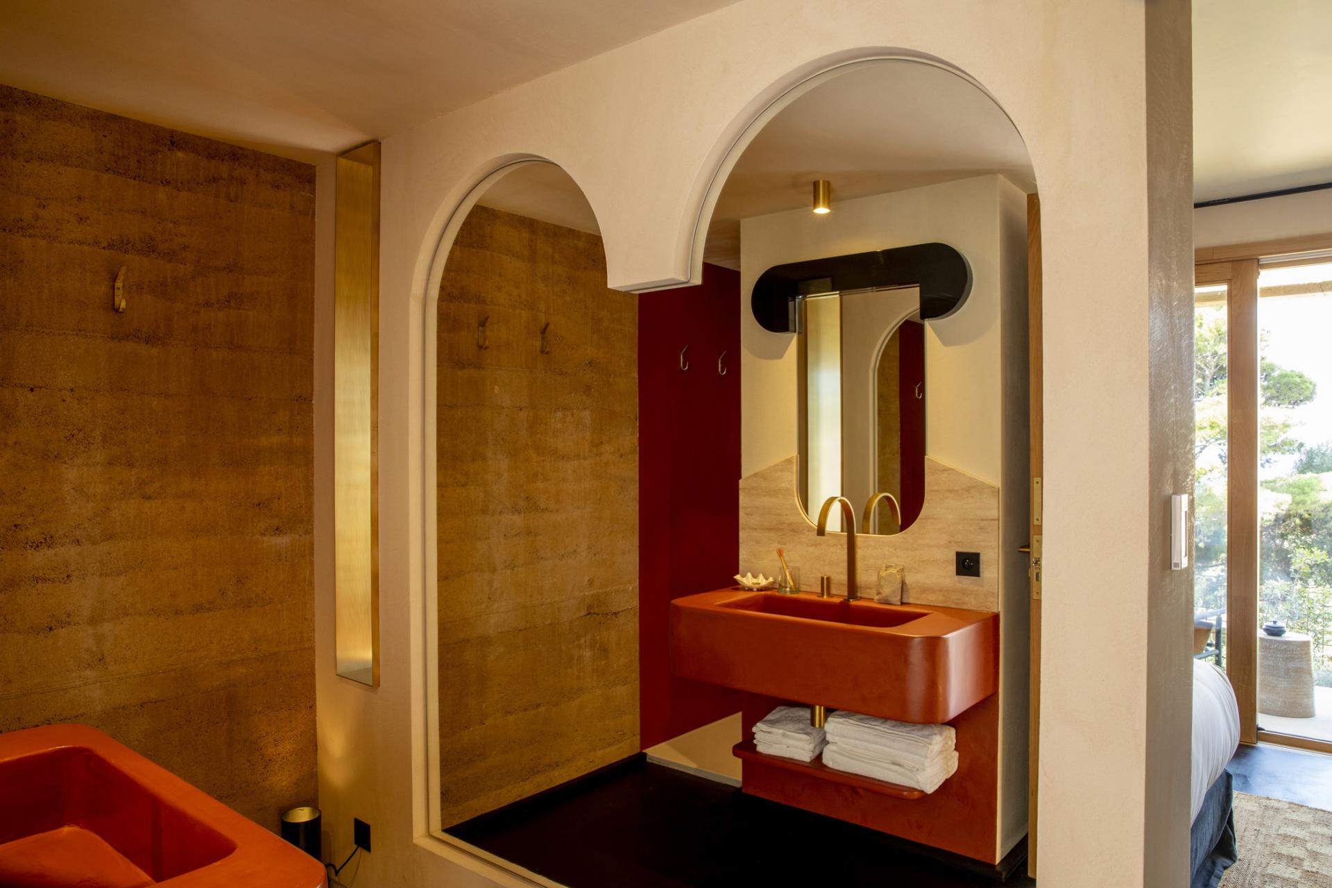 Construites en restanques, les chambres A Terrazza épousent naturellement le terrain pentu. Leurs murs en pisé et lignes minimalistes créent une atmosphère élégante et apaisante.